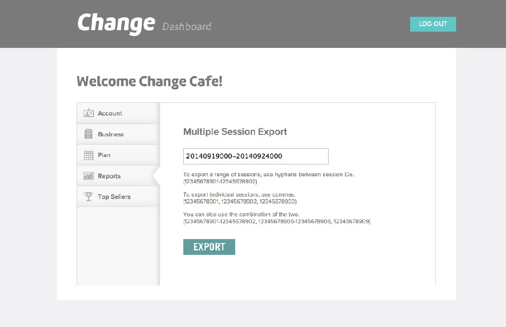 Log in to your Change Dashboard. Click Reports then click the View button next to the session you want to export. This will load the the session information, sales totals, and breakdown of payments. Click the Export button at the top of the page.